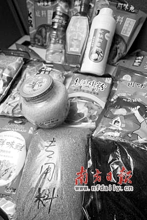 除了火鍋、米線使用的“飄香劑”外,能在市面上買到的還有“肉松散”、“肉香王”、“辣椒精”、“肉味精”、“排骨味香膏”、“鴨味香膏”、“牛肉味膏”等各種添加劑。“很多湘菜館、東北菜館老板都來購買‘肉香王’,不管是鹵味還是燒菜,效果都很好,可以送貨上門。”該批發商說。