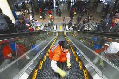 1月19日上午,記者在北京西客站看到,車站旅客較前幾日明顯增多,但秩序井然。車站工作人員隨時待命。圖為一位清潔工正在擦洗電梯,她說今年要加班回不了老家。記者 楊登峰 攝
