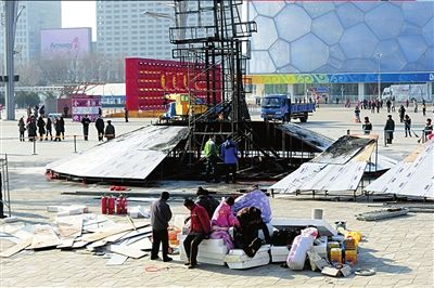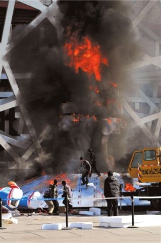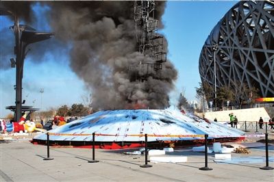 昨天中午,國(guó)家體育場(chǎng)西側(cè)50米處,一座正在施工中的塑料雕塑“祥云玉兔”突然起火。當(dāng)事工人稱,可能是焊接點(diǎn)濺出火花,引燃底座的泡沫材料,致使整體結(jié)構(gòu)起火。