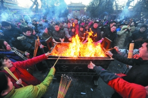 2月3日早上,雍和宮,眾多游客在大殿前進香祈福,整個雍和宮青煙彌漫。當天,共有6.6萬人在雍和宮進香祈福。本報記者 楊杰 攝