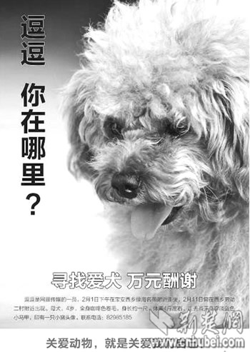 “貼廣告,發(fā)傳單,發(fā)微博,同事們幾乎動用了所有的方式”,舒先生稱,在登報紙廣告之前,尋找逗逗的費用花銷就超過兩萬元(這只貴賓犬的市場價不過千元)。