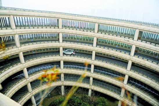 進入坡道后,這就開始了“繞圈子”:車身沿著坡道斜著一直向上爬行,車子時速保持在10公里左右。1圈、2圈……整整繞了3個大圈子、爬行了2分鐘后,眼前終于豁然開朗,偌大的一個屋頂停車場出現在眼前。