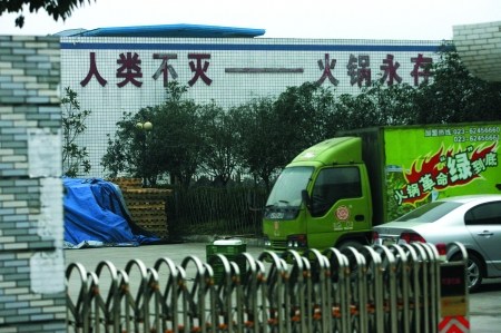 昨日上午,記者來到南岸區(qū)該工業(yè)園,找到了網(wǎng)友所說的雷人標(biāo)語。記者看到,在兩棟廠房的外墻上,貼有16個(gè)大字:“不抓質(zhì)量,天誅地滅”、“人類不滅,火鍋永存”,字體醒目。