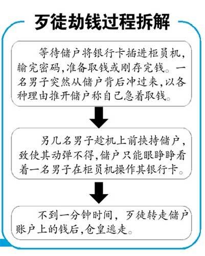 “我剛把密碼輸進(jìn)去,幾個(gè)男人就上來一把推開我,然后強(qiáng)行把我卡里的錢轉(zhuǎn)走,這個(gè)過程只有一分鐘左右,我根本就不能反抗。”昨日,在厚街經(jīng)商的李先生向記者講述了他取錢時(shí)遭遇歹徒強(qiáng)行轉(zhuǎn)賬的案情。而在之前,同樣是在厚街工作的郭小姐也遭遇過相似的情況,兩人分別損失了4萬多元。