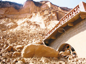 今年2月22日晚9時(shí)許,滑坡山體再次出現(xiàn)塌方。“這次更厲害,泥土塌下來把幾孔石窯砸裂,堵塞了溝道。移民新村共新建石窯洞54孔,這兩次塌方就掩埋了17孔。”一名村民說。