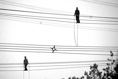 2月25日晨,記者來到三峽大壩附近的4號高壓鐵塔。4號高塔位于秭歸山區,站在山頭遠遠可看見三峽地下電站。沒一會,就迎來從山里走出的“空中來客”。高壓塔上共有6相導線,每相導線上均有一名巡線工。高壓線離地有近4層樓高,線上的6名巡線工抓著兩股高壓線,腰間系著保險繩,踩著高壓線一步步向前挪動。有時,巡線工會停下來,拿出紙筆不時紀錄,有時巡線工則拿出相機,對著線下拍攝。