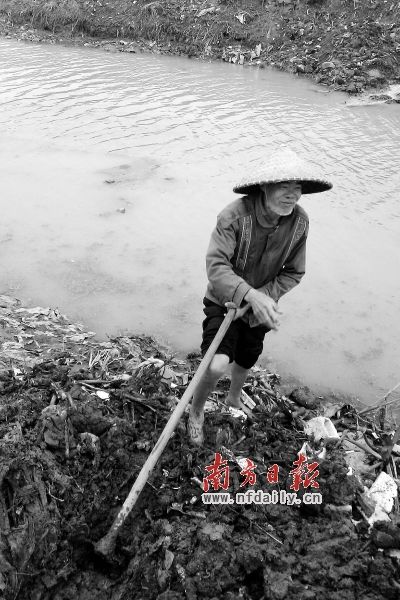 2月26日,雷州東洋灌區,城內電灌一站旁,開闊的農田中,鄉親們正在為春耕忙碌。頭戴蓑帽、68歲的何世振赤腳踩在污泥和垃圾充塞的河道里,一腳深一腳淺地將被掩埋的排水管挖開。