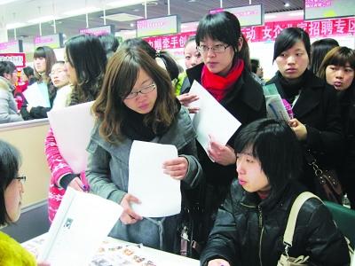 昨天的這場招聘會是女大學(xué)生專場,雖然并不阻攔男生入場,但記者在現(xiàn)場看到,前來應(yīng)聘的基本上是清一色的“娘子軍”,盡管偶爾也能看到男生的身影,但一問才知道,他們幾乎都是來“打醬油”的。男生小吳就是其中一位,“我就是幫女朋友來投簡歷的,”他告訴記者,女朋友臨時有事來不了,于是就托他代投。而另一位男生周同學(xué)則顯得有點(diǎn)窘迫,笑著對記者坦稱“鴨梨很大”:“起初我并不知道是女生專場招聘會,在路上聽同學(xué)說有招聘會,就回學(xué)校拿了幾份簡歷趕過來。結(jié)果進(jìn)門一看就傻眼了。”不過好不容易來了一趟,小周還是頂著“鴨梨”在招聘會場轉(zhuǎn)了一圈,“我學(xué)的是市場營銷,總共投了三份。”