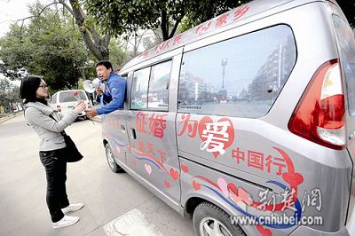 “征婚游天下,為愛(ài)中國(guó)行。”昨日上午,一名黑龍江男子開(kāi)著一輛面包車(chē),來(lái)到武漢大學(xué)門(mén)口吆喝。這哥們不是開(kāi)婚慶公司的,也不是為“相親節(jié)目”搖旗吶喊,而是走遍全國(guó)為自己征婚的金英奇。