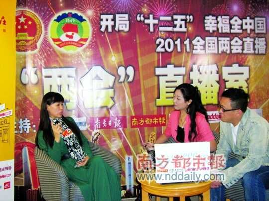 美女委員張曉梅(左)做客南方報(bào)業(yè)南都全媒體兩會直播室,暢談“讓女性回家”及“剩女”等熱點(diǎn)話題。中為主持人、南都記者裘萍、右為男嘉賓、南都記者劉可。 鄒高翔 攝