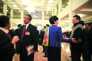 入場(chǎng)前,委員們?cè)谂收。昨日下午,全?guó)政協(xié)十一屆四次會(huì)議第四次全體會(huì)議召開。本報(bào)記者 韓萌 攝