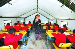 當日,云南省盈江平原鎮崗勐中心小學震后正式復課。在成都軍區某師官兵的援助下,軍用帳篷如期搭建好,四五年級的同學們坐在帳篷教室里朗朗讀書。這次地震使該學校基本被毀,所有教學樓都被震成危房。幸運的是,由于平時經常進行逃生演練,學校300多名學生、老師無一受傷。新華社記者 秦晴攝