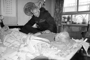 “照顧病人還要細(xì)心,病人最怕長(zhǎng)褥瘡,一旦長(zhǎng)了褥瘡,傷口潰爛難愈,極易感染。平躺一會(huì)兒,側(cè)著躺,三面倒,看哪面皮膚發(fā)紅,就少躺一會(huì)兒。夏天,胯骨部位還要經(jīng)常用酒精消炎,平均倆小時(shí)給她翻一次身……”多年的護(hù)理經(jīng)歷,讓劉俊明成了“專家”。讓他欣慰的是,十幾年來老伴沒有長(zhǎng)過一個(gè)褥瘡,也沒有感冒過一次。