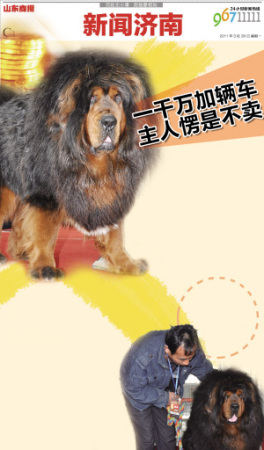 “我出1100萬再加上一輛好車,你把狗賣給我吧。”“不行,我這藏獒大概價值2000萬呢!”近日,“2011年全國第二屆精品藏獒交易博覽會”在濟南長清區濱湖大道園博園國際會展中心舉行,全國的頂級藏獒血系以及全國百強獒園率領幼獒軍團集聚山東,其中幾條價值數千萬的藏獒,更是吸引了眾多養狗愛好者和普通市民的強烈關注。