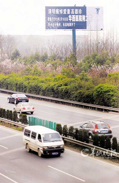 27日22時32分,新浪認(rèn)證用戶“學(xué)海劉學(xué)海”發(fā)布微博稱,27日下午約3點,一名男子在成溫邛高速公路旁豎立了一幅巨型廣告牌悼念亡妻,內(nèi)容為:“清明痛悼愛妻高德珍:愛妻于2011年2月18日在華西醫(yī)院附二院手術(shù)臺分娩時,永遠(yuǎn)地離開了。”