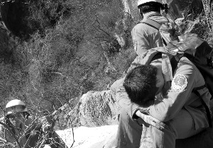前日,救援人員把被困人員帶到直升機下等待救援。記者 王貴彬 攝