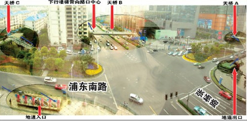 俯瞰浦東南路張楊路路口,周邊商場林立,3座天橋,一條地道獨立分布,行人斜穿路口需要爬2座天橋,且其中一座的下行樓梯背向路口中心。