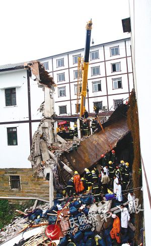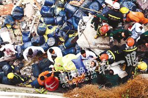 昨日(12日)是九龍坡區(qū)走馬鎮(zhèn)趕場(chǎng)天,一輛外地牌照的大貨車行至走馬老街下坡拐彎處時(shí),徑直沖向公路左側(cè)民房,將民房部分樓面撞毀,車頭陷入樓房地下室。由于報(bào)警電話稱車內(nèi)有7人被困,包括九龍坡區(qū)政府、公安、安監(jiān)、衛(wèi)生、消防等部門(mén)及時(shí)趕到現(xiàn)場(chǎng)救援。