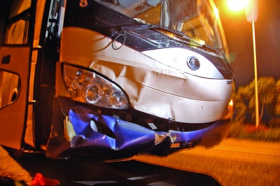 大客車前臉被撞癟,擋風(fēng)玻璃破碎。