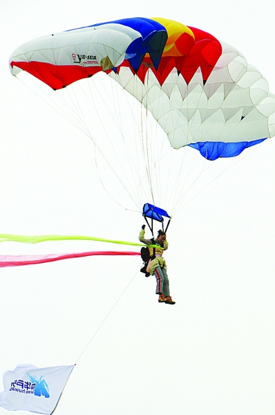當(dāng)天中午,許多市民聚集在太倉市金倉湖公園草坪上,眾多來自五湖四海的驢友還就地搭起了帳篷,翹首以盼“牛郎織女”高空跳傘的表演。11點10分左右,金倉湖公園上空飛來兩架滑翔機,數(shù)千名圍觀的市民和游客頓時歡呼雀躍起來,紛紛拿起了早已準(zhǔn)備好的相機,對準(zhǔn)天空一頓猛拍。“牛郎”第一個降落,離事先確定好的位置絲毫不差。緊接著,“織女”也在眾人的期盼下緩緩降落。不過由于當(dāng)天風(fēng)力較大,“織女”在天上被風(fēng)吹得偏移了方向,然而在“織女”的努力下,降落傘還是緩緩地降落下來。不過,降落的地點離事先確定好的位置相差十幾米的距離,降落傘差一點就被風(fēng)刮到了樹枝上。剛一落地,“織女”就迫不及待地尋找先落地的“牛郎”,兩人激動地?fù)肀г谝黄稹U勂鸶呖丈系母杏X,“織女”興奮地對記者說:“天上太冷了,只有兩三攝氏度,而我只穿了很薄的衣服,還是落地的感覺比較溫暖。”本來在高空似乎十分遙遠的“牛郎”“織女”,一下子居然離得那么的近,讓許多在場的人欣慰不已,禁不住鼓起掌來。