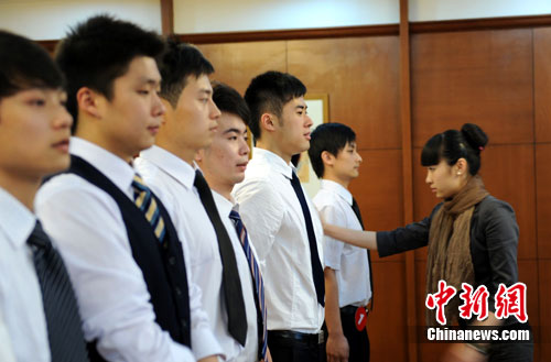 白襯衣、黑皮鞋、職業微笑,招聘現場,300多名準“空姐空少”們一身職業裝束,還不時對著鏡子練習站姿和“八顆牙微笑”。