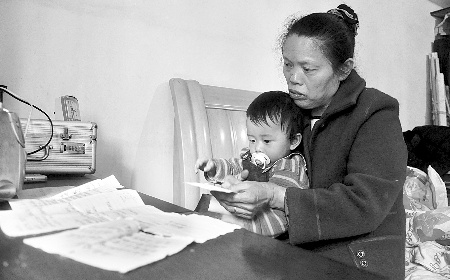 昨日,抱著揚(yáng)揚(yáng)的蹇女士望著桌子上的一堆欠條顯得無奈。蔣雨龍 攝
