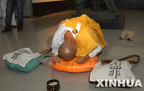 資料圖片:2006年5月11日,日本僧人巖田隆造在哈爾濱侵華日軍第七三一部隊罪證陳列館的活體試驗展廳為侵華日軍的當年惡行謝罪。王茜 攝