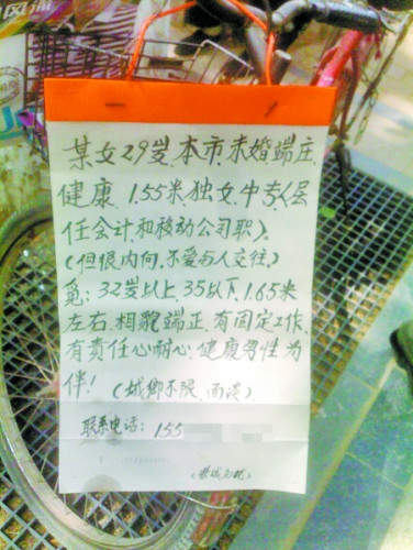 兒女的婚事一直是父母心中的大事。當今,“剩男剩女”與日俱增,“男大不婚、女大不嫁”的現象越來越普遍,令不少家長愁眉不展,無奈之中他們只好親自上陣。在鄭州嵩山路上的一個小游園內,每逢周末,由父母們自發組成的相親會就會熱鬧開場。隨著相親會上人數越來越多,父母開出的條件也越來越高:男要錢女要貌、高學歷、好工作,樣樣不能少,更有心急的家長虛報子女條件。一些年輕人對父母的這種做法表示理解,但難免覺得“有點煩”,希望父母能尊重兒女的意見。