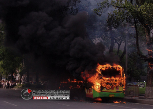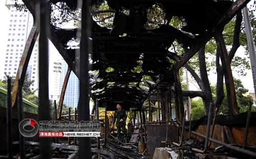 (17時(shí)30分,大火被撲滅,整個(gè)公交車已被燒成空空的鐵架子。圖/瀟湘晨報(bào)滾動(dòng)新聞?dòng)浾?趙尚渝)