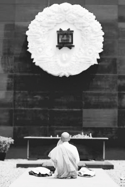 上好香,老人從肩上卸下包放在兩側,然后撿起一塊小石子壓住被風吹起的“謝罪”布角,掏出“太鼓”,脫下球鞋,面對“奠”字長跪磕頭。幾分鐘后,打坐,手敲“太鼓”口念佛經(jīng),為南京大屠殺30萬遇難的中國人祈禱。很多人聽說老人是一人自費到此謝罪,被觸動了,“其實挺不容易的……”