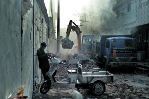 5月5日,大興區舊宮鎮南小街,一處路邊的違建正在被拆除。4月25日的大火,讓這條街道的所有違建都要被拆除,至昨日,對侵街占道違法建筑的拆除工作,已基本完成。據介紹,現在進行的是“幫拆”,拆之前須取得戶主同意。戶主也可在規定期限內,自行拆除。本報記者 楊杰 攝