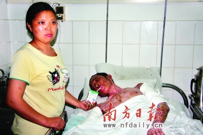 昨日,因撈地溝油時不慎跌入油鍋被燙成重傷的39歲貴州藉男子何勇松了一口氣。昨日下午5時,東莞市塘廈鎮(zhèn)委委員盧海祥到塘廈醫(yī)院看望他時說,政府已經(jīng)扣押了地溝油加工黑作坊主的部分財(cái)產(chǎn),公安部門已在全力緝拿地溝油作坊主,政府會為其想辦法解決醫(yī)療費(fèi)用。