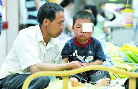 昨天,孫金鐘躺在兒童醫院病床上,眼睛裹著紗布。孫金鐘的父親孫續征說,他家住彭水梅子埡鄉梅花村。前天上午,小金鐘跟外婆在一起,外婆在地里干活,他就獨自到幺外婆家玩。