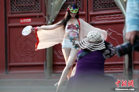 15日,山西太原文廟內(nèi)上演一場人體彩繪秀。三名半裸、身繪中國傳統(tǒng)國畫的女模特,在孔子腳下“搔首弄姿”,展示人體藝術(shù)。