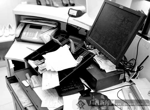 收銀臺被砸壞的抽屜,一些毛票和單據(jù)凌亂不堪地放在桌上。記者唐寅 攝