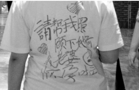 網(wǎng)友“cinya”的原帖為:姐去逛商場,無意間巧遇一件極滑稽又感動的事,一個穿白色T恤的孕婦,衣服背后一行手寫紅字:“請幫我照顧下,我老婆懷孕了。”文字的間隙,還配有幾個紅色的愛心,看上去也是手繪而成。