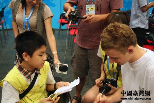 深圳小學生與外國青年記者在開營儀式上交流。(中國臺灣網 于斯文 攝)