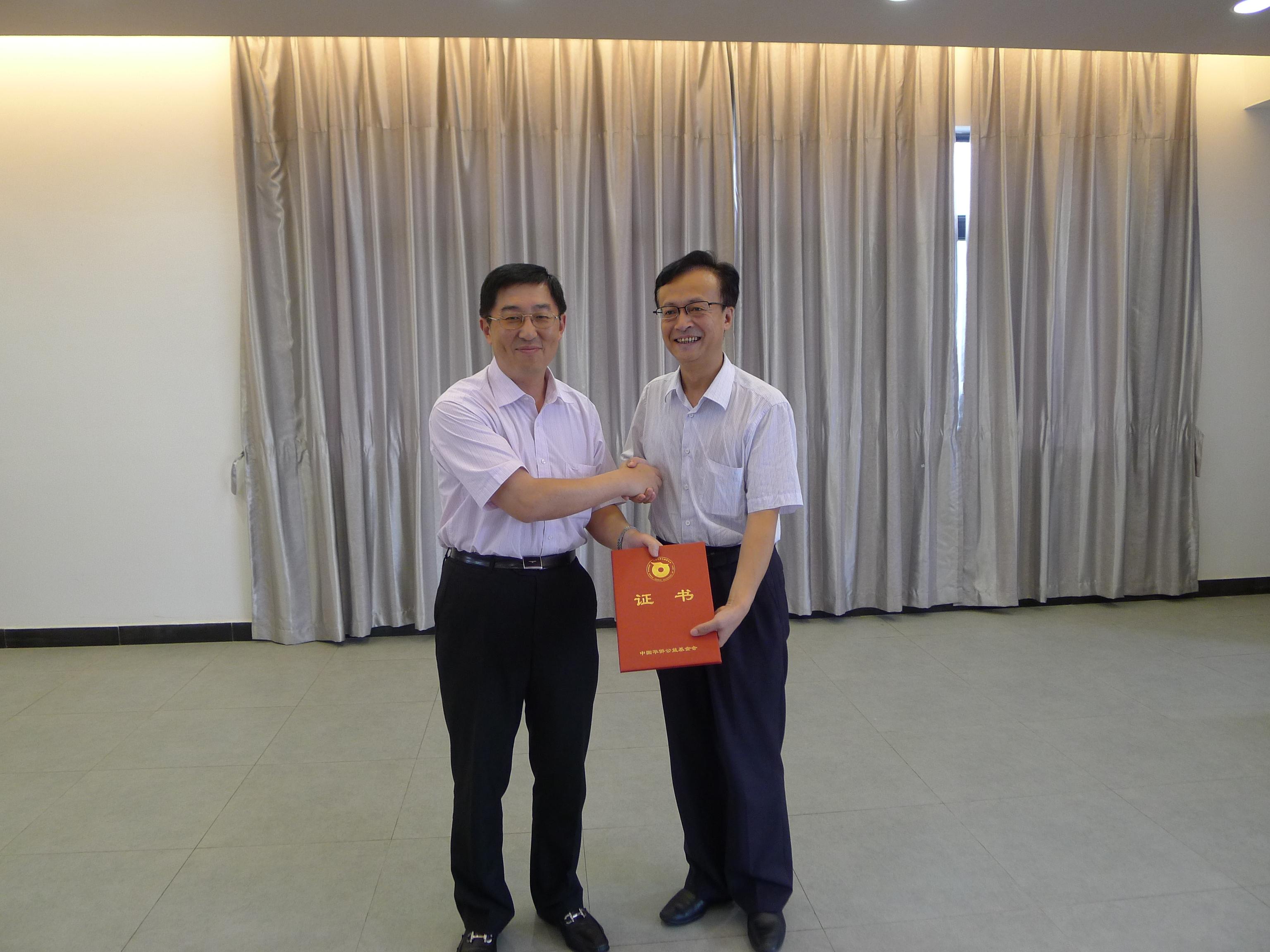 中國僑聯主席、中國華僑公益基金會理事長喬衛(中),神華集團總經理助理、財務部總經理、神華公益基金會副理事長兼秘書長翟日成(右)向北川中學校長劉亞春捐贈支票。