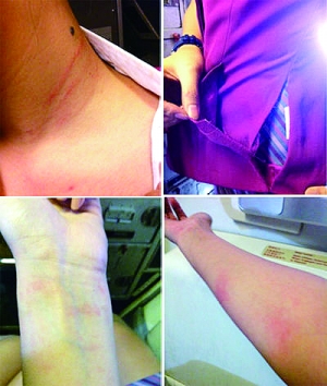 空姐“花Money買毛豆”微博上貼出照片顯示,其身上有傷痕、衣服被扯破。