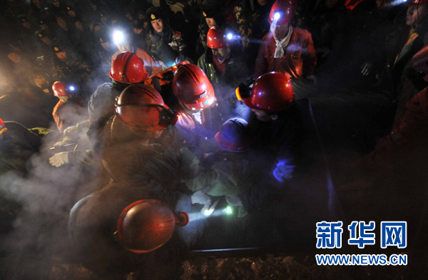 12月7日,救援人員正把營救上的礦工抬下礦車。當日,在七臺河市福瑞祥煤礦,救援人員成功營救出四名礦工。 12月1日23時40分,黑龍江省七臺河市福瑞祥煤炭有限責任公司八井發生透水事故,事故發生時共有22人在井下作業,8人升井,3人遇難,11名礦工被困井下。新華社記者王建威攝