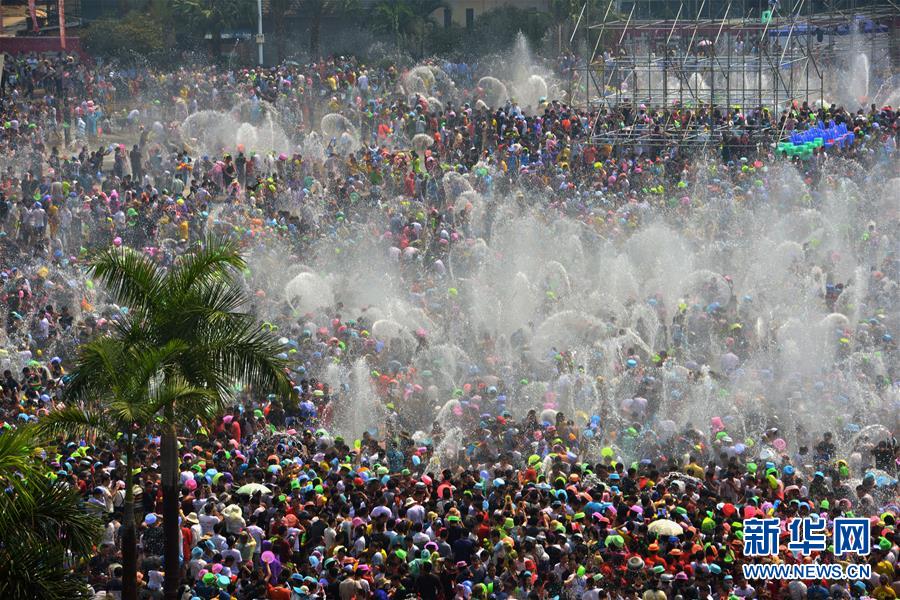 4月15日,人們在西雙版納景洪潑水廣場參加潑水狂歡。當日適逢潑水節,在云南西雙版納景洪市,數萬名當地群眾和外地游客齊聚潑水廣場,潑水狂歡,互送祝福。 新華社發(萬霜降 攝)