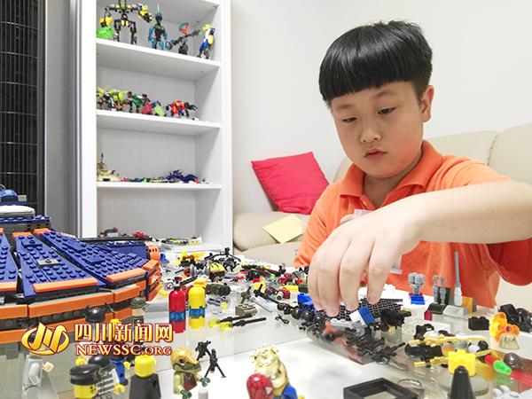 6月30日下午,楊一郎坐在客廳的板凳上,一邊看著電視里的美國大片,一邊忙著拼裝樂高玩具。在客廳的小桌子上,放滿了這些玩具。電視機前的一長串玩具,已經是他拼裝好的。每一個拼裝好的玩具,他都會放在這里。初步數了一數,大概有三四十個。