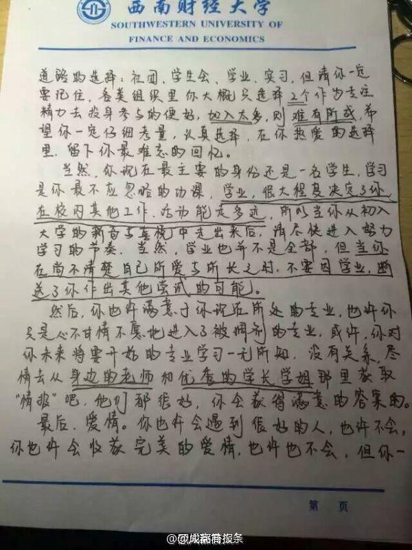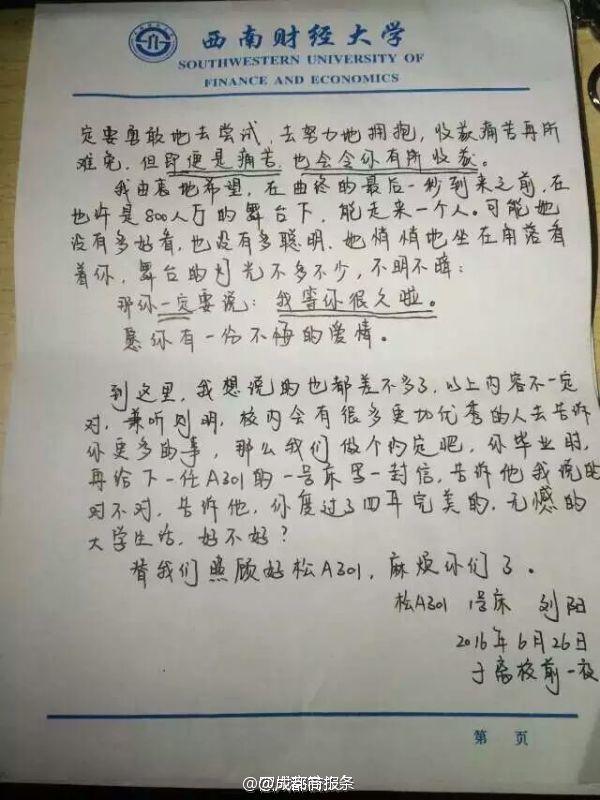 未見卻真情!畢業(yè)學(xué)長給未來同寢學(xué)弟留“內(nèi)心獨白”】西南財經(jīng)大學(xué)的劉陽,在畢業(yè)離校前夜,給未來入住寢室的學(xué)弟留下一封信:“此刻在你身邊的人,將是4年后的今天你最不舍的人”“對于愛情,即使是痛苦也會令你有所收獲”…學(xué)弟看到會不會滿滿感動?via四川高校頭條