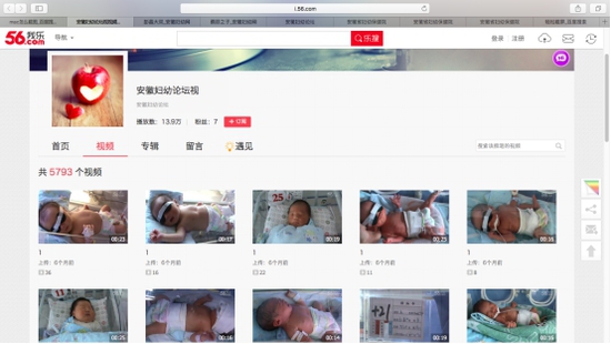 記者發(fā)現(xiàn),該視頻的上傳者為“安徽婦幼論壇視”,該賬號(hào)共上傳了5793個(gè)視頻在56網(wǎng)上,全是新生兒的視頻,很多視頻名字直接用“某某”之子、“某某”之女標(biāo)注。點(diǎn)開后,視頻里的孩子眼睛被蒙著,但其他的信息非常清晰,就連診斷癥狀黃疸、早產(chǎn)等也一覽無余。