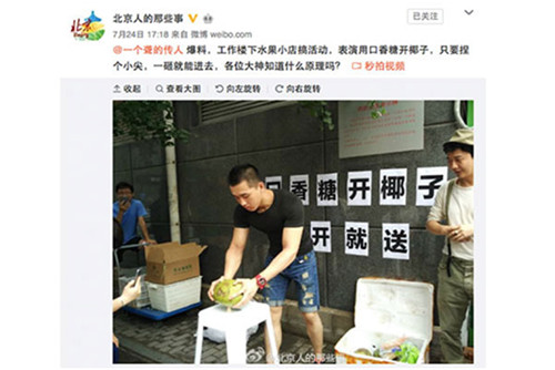 在微博上曬圖用口香糖打開椰子的網友,都是將口香糖做成圓錐狀,放在一個固定的平面上,用雙手將椰子迅速地砸向口香糖,瞬間,椰子就被戳出一個開口。還有的網友突發奇想用口香糖開香瓜、開哈密瓜,甚至有的水果店還趁勢搞起了“口香糖開椰子,打開就送”的促銷活動,吸引很多路人圍觀參與。