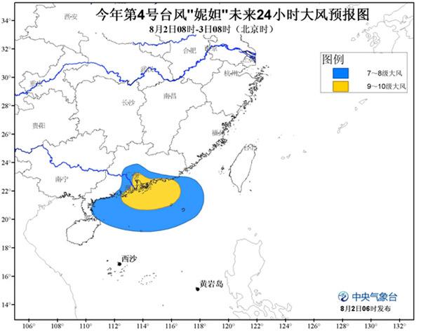 大風預報:8月2日08時至3日08時,南海北部、廣東沿海及珠三角地區將有7-9級大風,部分海域和地區風力可達10級,陣風11-12級。