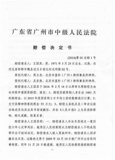 2013年,廣州中院啟動再審程序并作出判決,撤銷前面的終審裁定和越秀區法院一審判決中的量刑部分,但維持了一審法院定罪部分,以非法買賣、運輸槍支罪,改判王國其有期徒刑4年。由于低于法定刑期,判決需報請廣東高院與最高法核準后生效。