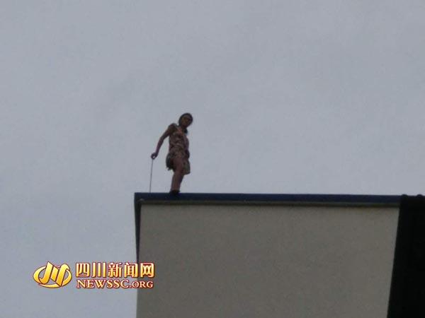 白靜站的墻沿只有二三十公分寬,十分危險。她并不是真的想跳樓,從她右手的動作就可以看出來。在她的右側剛好有一根避雷針,她用右手緊緊握住,以避免自己不慎跌落。白靜在樓頂向樓下的民警喊話,說一切都要按照她的意思來辦,否則她就要跳樓。