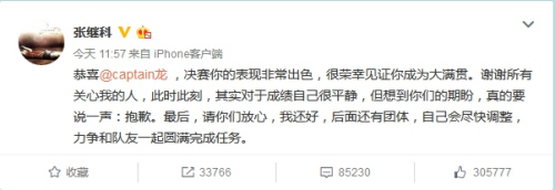在決賽輸給馬龍沒多久,北京時間12日中午,張繼科在微博上首先恭喜馬龍奪金,“決賽你的表現非常出色,很榮幸見證你成為大滿貫!比缓蟊硎,“對于成績自己很平靜,但想到你們的期盼,真的要說一聲:抱歉。”最后,張繼科讓大家放心,他很好,正在為團體賽作調整,力爭和隊友一起圓滿完成任務。