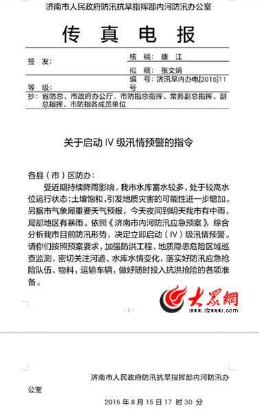 今天上午,大眾網記者從濟南市內河防汛辦獲悉,受近期持續降雨影響,濟南市水庫處于高位運行,該市內河防汛辦已于8月15日下午17時30分,啟動IV級汛情預警。 (大眾網-山東24小時客戶端記者 王磊)
